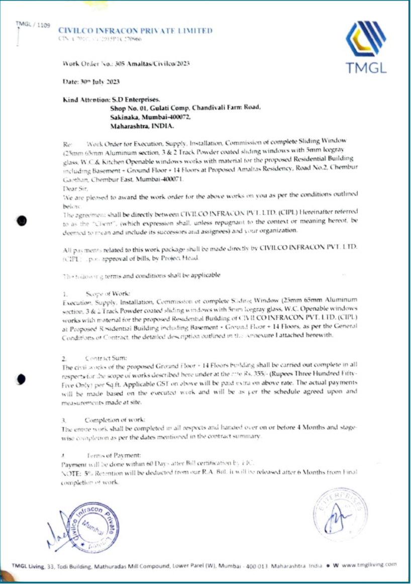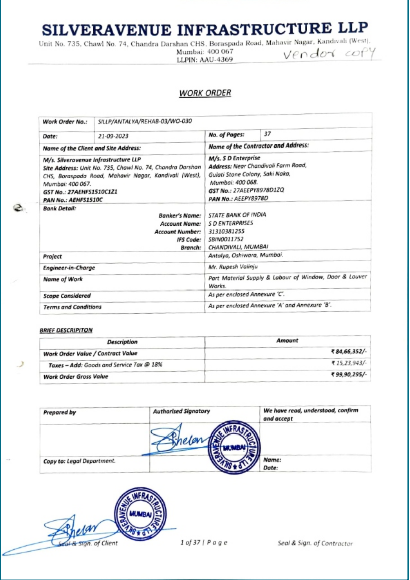 Explore our official work orders from leading developers and infrastructure companies, showcasing our commitment to delivering premium facade solutions across India.